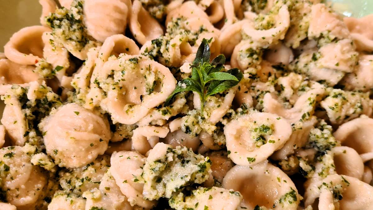 Die Pasta kochen, bis sie al dente ist. Zwei, drei Esslöffel vom Kochwasser für eine bessere Bindung ins Pesto rühren. Wir hatten Orecchiette aus Apulien, die wir abtropfen ließen und dann mit dem Pesto im Topf verrührten. Erst dann die Portionen anrichten, mit einem oder zwei Cashewkernen oder einem Trieb von der Verbene dekorieren. Wer will, kann noch weiteren Käse über die Pasta reiben.