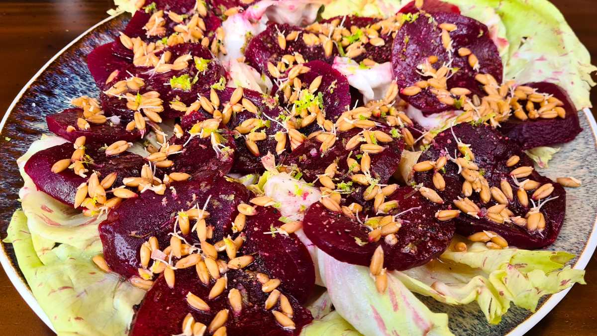 Salate mit Roten Rüben sind uns immer willkommen. Am liebsten garen wir sie selbst im Backofen, denn da verströmen sie einen wunderbaren Duft in der Wohnung, aber wenn es schnell gehen soll, nehmen wir auch vorgegarte. Gerade sind die ersten Salatköpfe des Radicchio Variegato di Castelfranco in Wien erhältlich, so wollten wir eine entsprechende Kombination zusammenstellen.