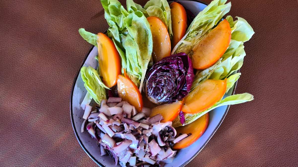 Den Radicchio del Poc (auch Radicchio Cicorino, Radicchio col gambo oder im friulanischen Dialekt Lidric cul poc genannt – siehe Radicchio Vielfalt, junge kleine Radicchio-Herzen mit kleinen Blättern und einem zarten Wurzelstrunk an der Basis) waschen, etwas zerpflücken und auf zwei Teller im Halbkreis anrichten. Zwischen die bunten Salatstücke die in Spalten geschnittene Kaki stecken – gerade noch sind die letzten italienischen dieser Saison zu haben. Den Salat mit Salz und Pfeffer würzen und dem Dressing beträufeln. Die warme Radicchio-Zwiebelmischung auf einem frei gelassenen Teil des Tellers anrichten und diesen Wintersalat mit italienischem Landbrot servieren.
