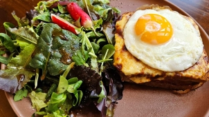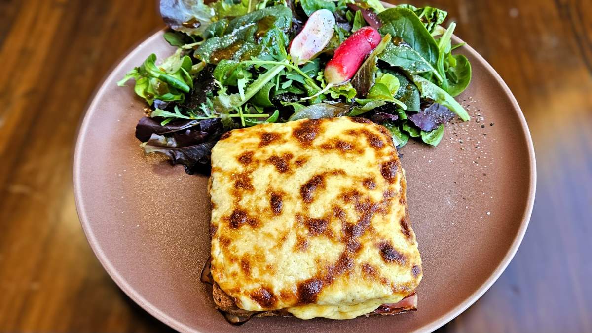 Wir, vor allem aber Johannes, sind Fans dieses französischen Imbisses. Er ist im Grunde ein Schinken-Käse-Toast, den die Franzosen mit Béchamelsauce und außen liegendem Käse zu einer eigenen Kreation gestaltet haben. 1910 soll das in Paris geschehen sein, wie immer ranken sich um die Entstehung von ikonischen Gerichten Legenden, auf die wir hier nur kurz eingehen wollen.
