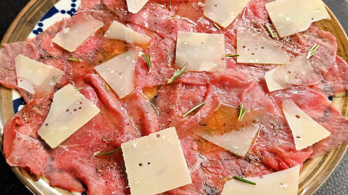 Die dünnen Fleischblätter auf zwei großen flachen Tellern möglichst nebeneinander und wenig überlappend auflegen, leicht salzen und mit dem frisch gemahlenen Pfeffer bestreuen. Mit Zitronensaft beträufeln und mit einem Löffel das Olivenöl gut über den Scheiben verteilen. Parmesan grob darüber hobeln oder reiben und, wer mag, Kräuter dazu geben. Wir haben wenige ganz junge, frische Rosmarinnadeln darüber verteilt. Dazu klassische Panini oder, noch besser, die Panini Carciofi mit den vielen knusprigen Enden und mit ihrer weichen Krume, mit der gut das Öl aufgetunkt werden kann.