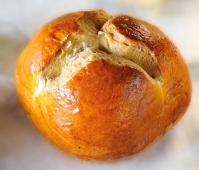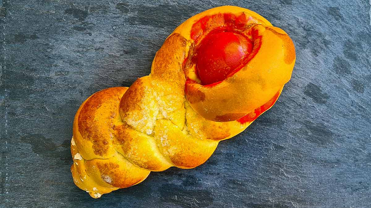 Zuletzt sind wir auf die Titole gestoßen. Die Titola ist ein kleiner Hefezopf, mit einer Art Schlinge am Ende, in die ein rot gefärbtes Ei eingesetzt wird. Nach der Überlieferung vor allem aus der griechischen und serbischen orthodoxen Kultur soll ihre Form an die Nägel der Kreuzigung und die rot gefärbten Eier an die Steine erinnern, auf die das Blut vom Kreuz getropft ist.