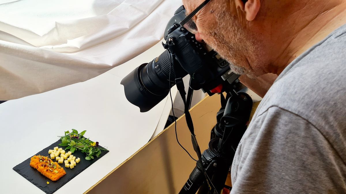 Nun konnte es beginnen. Wir richteten den ersten Salat an, es war der Tomatensalat mit Fisolen. Michael und wir testeten uns gegenseitig. Können die beiden kochen, verstehen sie das Anrichten und Präsentieren? Was wollen die beiden von meinen Fotos, was sollen meine Fotos können? Wie lange braucht Michael, um den Salat abzulichten? Welche Ansprüche stellt er an uns, damit seine Fotos seinen Vorstellungen entsprechen? Wir geben es zu, wir waren unsicher, er ruhig und souverän. Ein paar Tipps von seiner Seite waren hilfreich, und er freute sich über direktes Feedback von unserer Seite. In Kürze entstand eine kreative Arbeitsatmosphäre, die wir alle als bereichernd empfanden. Ulli setzte auf den Tellern viele ihrer optischen Ideen um, die sie aus der Patisserie entlehnte. Johannes konnte mit seinen Erfahrungen als Theaterregisseur auch punkten, wenn es um Fragen der Beleuchtung oder auch um Perspektiven des Gerichtes ging. Manchmal reichte eine Drehung des Tellers um ein paar Grade, damit der Salat besser aussah, oder eine kleine Änderung im Winkel des zusätzlichen Scheinwerfers, der ein warmes Licht auf den Teller sandte. Johannes war oft mit der Anrichtepinzette bewaffnet, um noch Kleinigkeiten auf dem Teller zu modifizieren. Wir hatten Spaß an der gemeinsamen Arbeit. Wir sahen aber auch, dass nicht nur das Salateherstellen in Serie, sondern auch das Fotografieren körperlich anstrengend war. Vor allem die Perspektive gradlinig von oben forderte vom Fotografen große körperliche Disziplin, wenn sich Michael auf der Leiter stehend direkt über das Motiv beugen musste. Das Rund des Tellers durfte dabei nicht verzerrt werden.