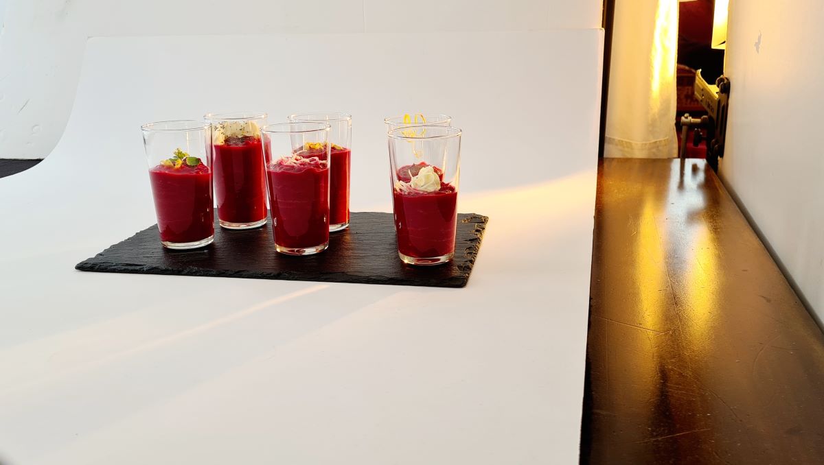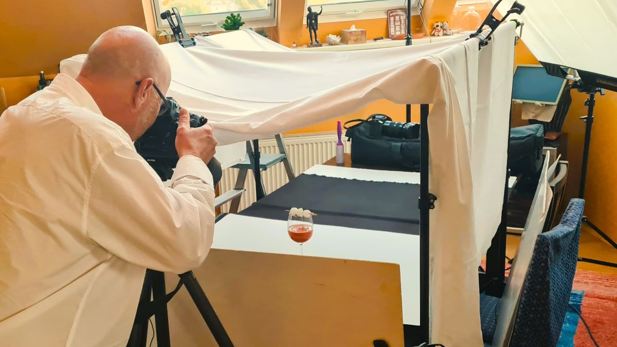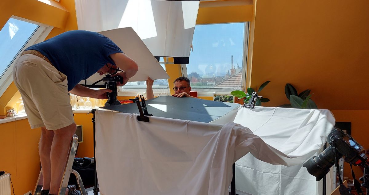 Michael – wir waren inzwischen per Du – kam mit beladenem Auto und baute sein Equipment zusammen: Auf unserem Esstisch, der zum Glück groß genug war, um ein kleines Fotostudio für zwei seitliche Perspektiven und eine Fotosituation direkt von oben einrichten zu können. Zum Essen gab es natürlich dann keinen Platz mehr. Da wir im Dach wohnen und eine sehr große Fensterfläche haben, war das Problem eher von zu viel als von zu wenig Licht. Es wurde mit Stativen und Leintüchern ein großes Zelt über den Esstisch gespannt, das das Sonnenlicht streute und weicher machte.