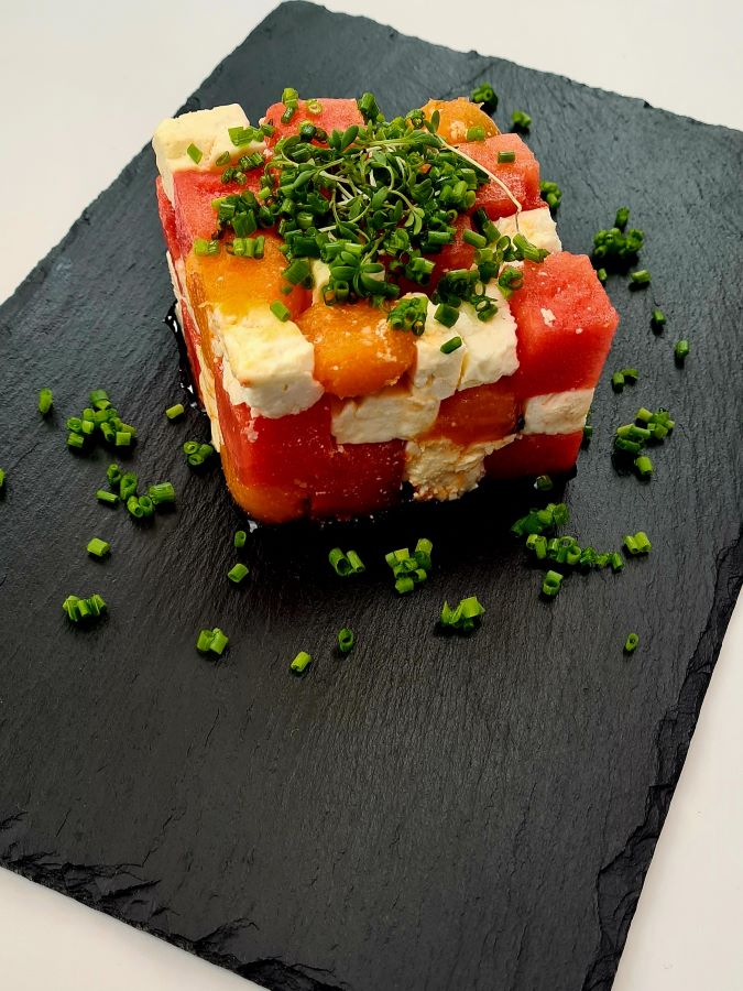 Der erste Arbeitstag neigte sich dem Ende zu. War waren recht flott vorangekommen, und auf Ulli wartete eine anspruchsvolle Anrichtevariante, die sie sich für den Melonenfetasalat ausgedacht, aber noch nie ausprobiert hatte. Nachdem die normale Version fotografiert war, kam die hohe Kunst des Salatwürfels dran. Ulli baute aus Wassermelonen-, Zuckermelonen- und Fetakäsewürfeln einen großen Würfel. Wir wussten nicht, ob er zusammenhalten oder auseinanderfallen würde, doch er hielt und war wunderschön anzusehen. Es wurden tolle Fotos.
