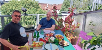 Wenn Michael uns nicht brauchte, richteten wir schon den nächsten Salat her. Manchmal aber musste Johannes einspringen und mit einem Fotokarton beispielsweise einen Sonnenstrahl abdecken, der einen zu harten Schatten auf den Teller warf. Michael machte nicht nur Pause, wenn wir im Zubereiten eines neuen Salates waren, sondern fotografierte unsere Mis en Place, uns selbst beim Arbeiten und das Ambiente unserer Küche. Es kamen fantastische Fotos zustande, die im Buch auch wiederzufinden sind. Der Verlag wollte zusätzlich Fotos haben, wenn wir am Markt einkaufen gehen und uns von den Produzentinnen und Produzenten vom samstäglichen Bauernmarkt die neue Ernte zeigen lassen bzw. diese erstehen. Das planten wir für den Samstag ein. Offen gesagt waren wir aber dann mit der Ausbeute von diesen Motiven nicht zufrieden. Eigentlich niemand. Wir waren viel zu fokussiert auf den Einkauf und die Abarbeitung der Einkaufsliste, als dass wir uns entspannt und locker fotografieren haben lassen. Gut, dass wir einen Sicherheitspolster im Juli eingeplant hatten.