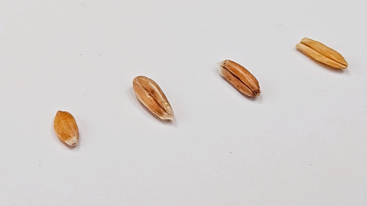 Auf dem Foto sieht man im Vergleich (v.l.n.r.) die Körner von Einkorn, Dinkel, Emmer und Hartweizen.