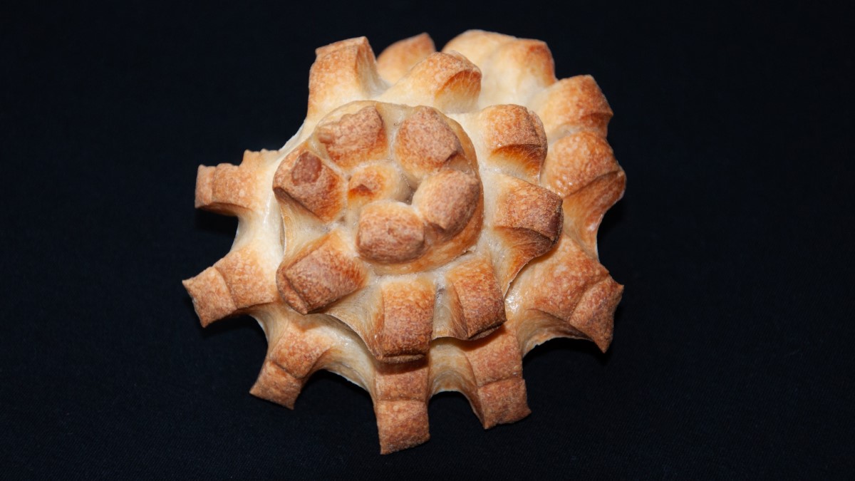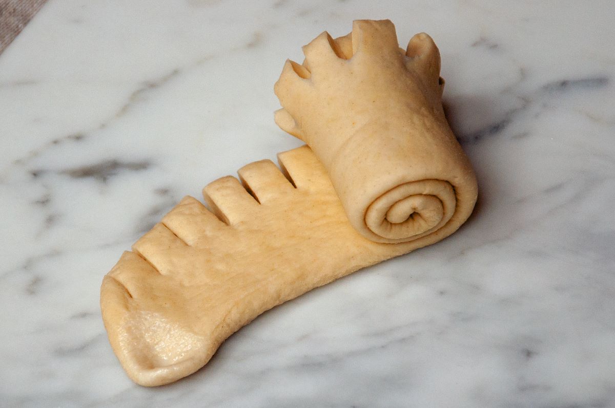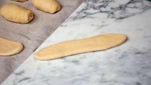 Den Teig auf eine dünn bemehlte Arbeitsfläche geben und in 8 gleich große Portionen à ca. 100 g teilen. Die 8 Teiglinge zylindrisch langformen und in einem Bäckerleinen abgedeckt 5 – 10 Minuten ruhen lassen. Die Teiglinge flach drücken und in lange, ca. 5 cm breite Streifen auf eine Dicke von 0,5 cm ausrollen, seitlich knapp alle Zentimeter ca. 8 mm tief einschneiden, der Länge nach aufrollen und das Ende leicht in die Unterseite drücken. Sollte der Teig etwas trocken sein, mit einem in Wasser getauchten Finger das Ende befeuchten und in die Unterseite drücken. Auf das Backblech stellen und abgedeckt 45 – 60 Minuten ruhen lassen.