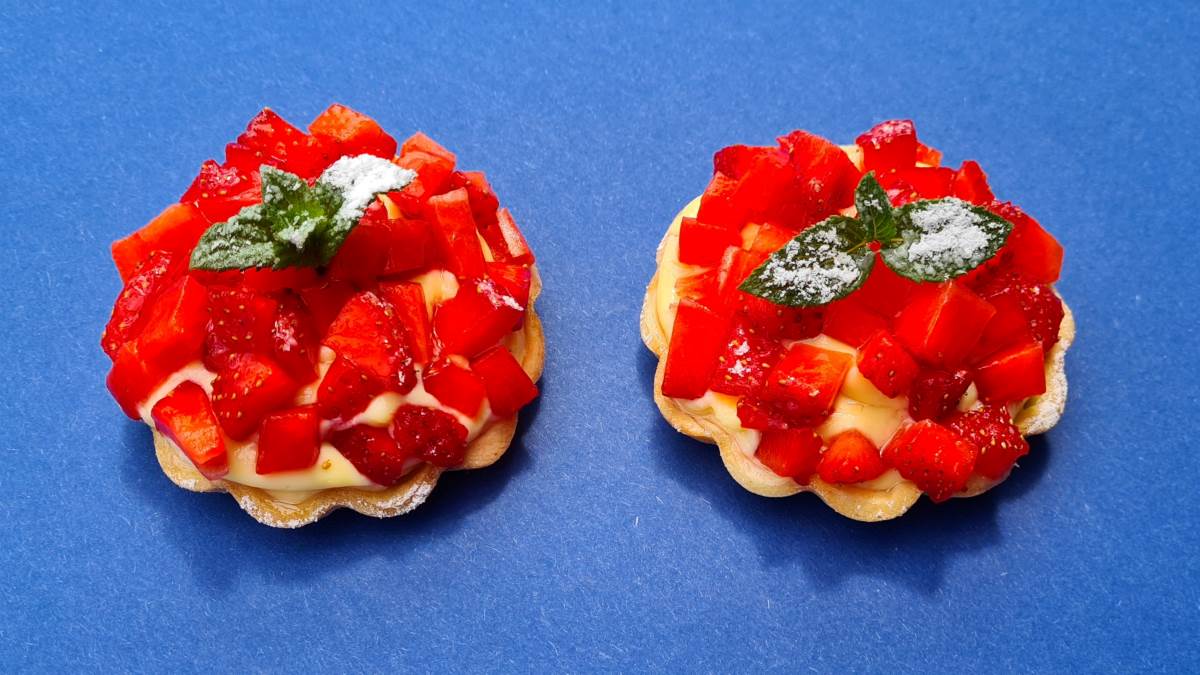 Nun werden die Böden der Törtchen mit der Creme befüllt. Wir machen das am Liebsten mithilfe eines Spritzsackes und einer Lochtülle (5 mm), so bleibt der Rand sauber und die Creme ist gleichmäßig aufgetragen. Die einfachere Variante ist es, dies vorsichtig mit einem Teelöffel zu machen. Nun können die Erdbeeren auf die Creme gelegt werden. Je nach deren Größe kann man sie achteln und im Kreis auflegen oder Scheiben schichten. Bei unserer Variante waren die italienischen Erdbeeren so groß, dass es sinnvoll war, diese einfach in kleinen Stückchen auf der Creme zu verteilen. Mit einem Minzeblättchen dekorieren und mit etwas Staubzucker bestreuen.
