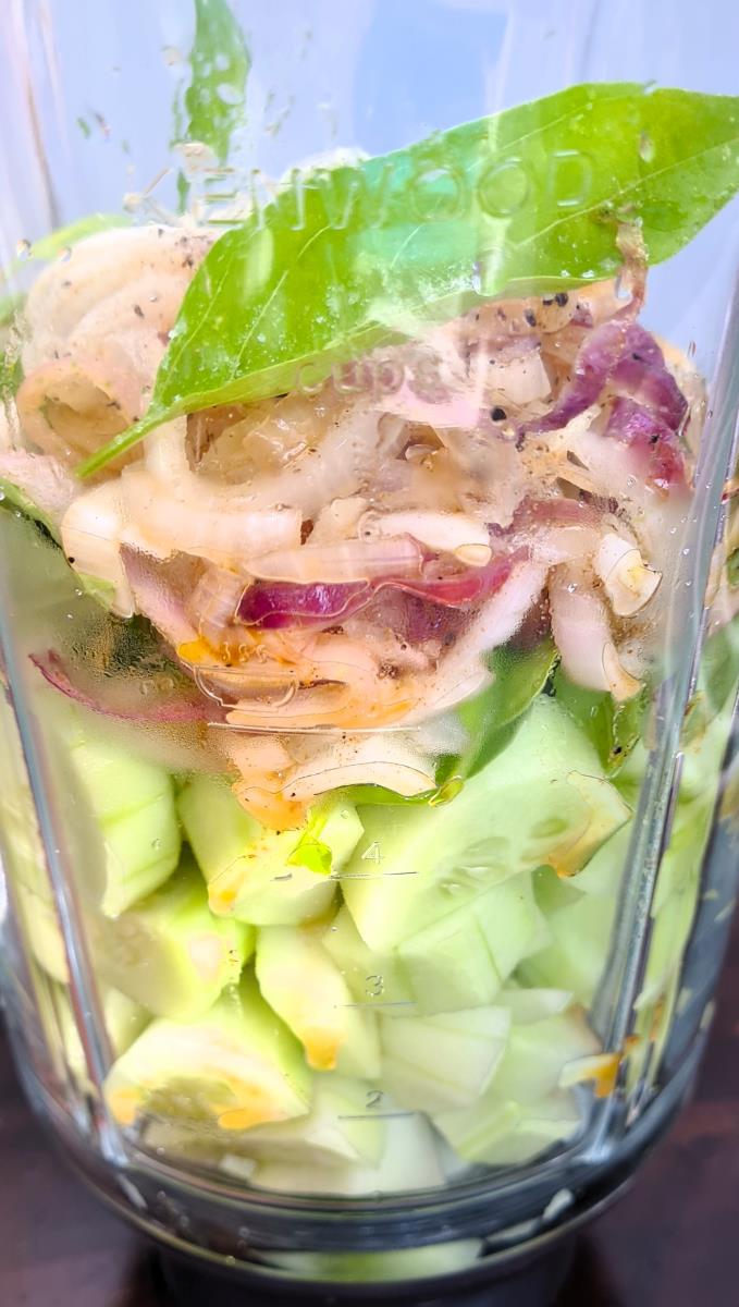 Die Zwiebel vom Grün trennen, dieses fürs spätere Anrichten beiseite geben. Die Zwiebel schälen und grob schneiden. Die Knoblauchzehe ebenfalls grob zerkleinern. In einer Pfanne das Öl erhitzen, den Zucker leicht karamellisieren lassen und dann Zwiebel und Knoblauch hinzugeben. Die Gewürze einrühren und ein wenig andünsten, nach zwei Minuten von der Hitze nehmen und abkühlen lassen.Kalte Basilikumgurkensuppe Mixer