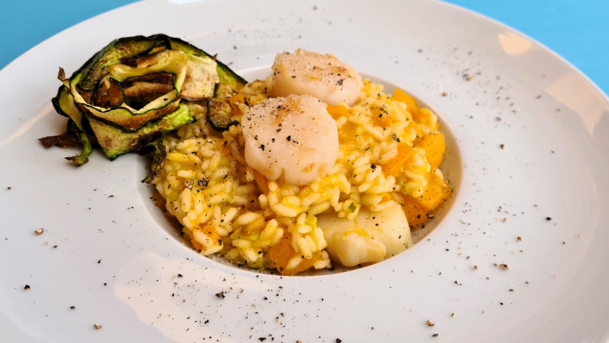 Die Webseite führt eine Menge Rezepte mit Acquerelloreis auf, die speziell für diese Sorte entwickelt wurden, darunter sind auch welche von Top-Köchen aus aller Welt wie vom Sternekoch Peter Brunel aus dem Trentino. Wir haben uns für ein einfacheres Rezept entschieden, das der Jahreszeit entspricht, dem Kürbisrisotto mit Jakobsmuscheln und gebratenen Zucchini, und es nach unseren Vorstellungen abgewandelt.