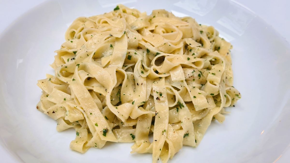 Nun die Sauce vorbereiten: Den Parmesan frisch reiben. In eine Pfanne die kalte Butter geben und bei schwacher Hitze schmelzen. Währenddessen nicht zu viel Wasser (max. 1,5 Liter, die Nudeln müssen gut bedeckt sein; je weniger Wasser, desto stärkehaltiger wird es, und das brauchen wir für die Sauce) zum Kochen bringen, gut salzen und die Bandnudeln hineingeben. Sie sind in maximal zwei Minuten fertig. Sobald die Nudeln im Wasser sind, bildet sich von der Stärke des Mehls Schaum auf der Wasseroberfläche. Dann kann mit einem Schöpfer etwas Kochwasser entnommen und auf die flüssige Butter gegossen werden. Sofort miteinander verrühren und leicht köcheln lassen. Die fertig gekochten Nudeln mit einer Pastakelle direkt aus dem Wasser in die Pfanne mit der Butter geben und verrühren, dann den geriebenen Parmesan hinzufügen. Die Sauce soll sämig werden, vielleicht ist noch ein wenig Kochwasser nötig. Schön weiterrühren, leicht salzen, schwarzen Pfeffer darüber mahlen und, wer mag, einen Esslöffel feingehackte Kräuter, Petersilie oder Basilikum, einrühren, bis alles miteinander gut vermischt ist. Auf zwei vorgewärmten Tellern anrichten und – mmmh! – genießen.
