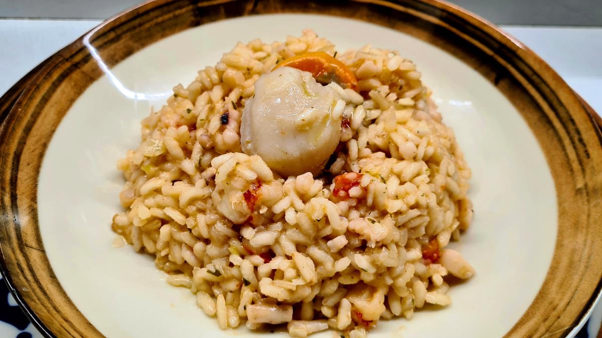 Wie immer begrüßt uns die Fischhändlerin in der Altstadt von Muggia freudig mit „Bentornati!“ und fragt, was sie uns Gutes tun könne. Diesmal bitten wir sie, uns Meeresfrüchte und Fisch für ein Risotto zusammenzustellen. Sie schlägt uns frischen Angler, ein paar rosa Garnelen, saisonale Seppie und schöne Jakobsmuscheln vor. Da haben wir absolut keine Einwände. In Kürze erhalten wir die Ware perfekt ausgenommen, geputzt und bereits zerkleinert, außer den Jakobsmuscheln, die bleiben natürlich ganz. Wir mögen den orangen Rogen sehr gerne, auch unsere Freunde schätzen das sehr und lassen ihn daher an der Muschel. Wer ihn nicht sehen mag, kann ihn mit den anderen Meeresfrüchten mitkochen und das Aroma nützen, wenn er sich zerkocht. Zusätzlich können allemal ausgelöste Mies- oder Venusmuscheln und dergleichen mitverwendet werden, aber diese Muscheln sind oft ein wenig fest oder hart, was zu Risotto nicht so gut passt. Wir lassen sie also gerne außen vor. Selbst gemachten Fischfond haben wir noch vorrätig, Zwiebel und Knoblauch kaufen wir bei Alice, der Gemüsehändlerin unseres Vertrauens, außerdem noch ein paar Kirschtomaten und ein kleines Büschel Petersilie. Abends kommen die Gäste, also geht sich noch locker ein Kaffee in unserem Stammcafé aus.