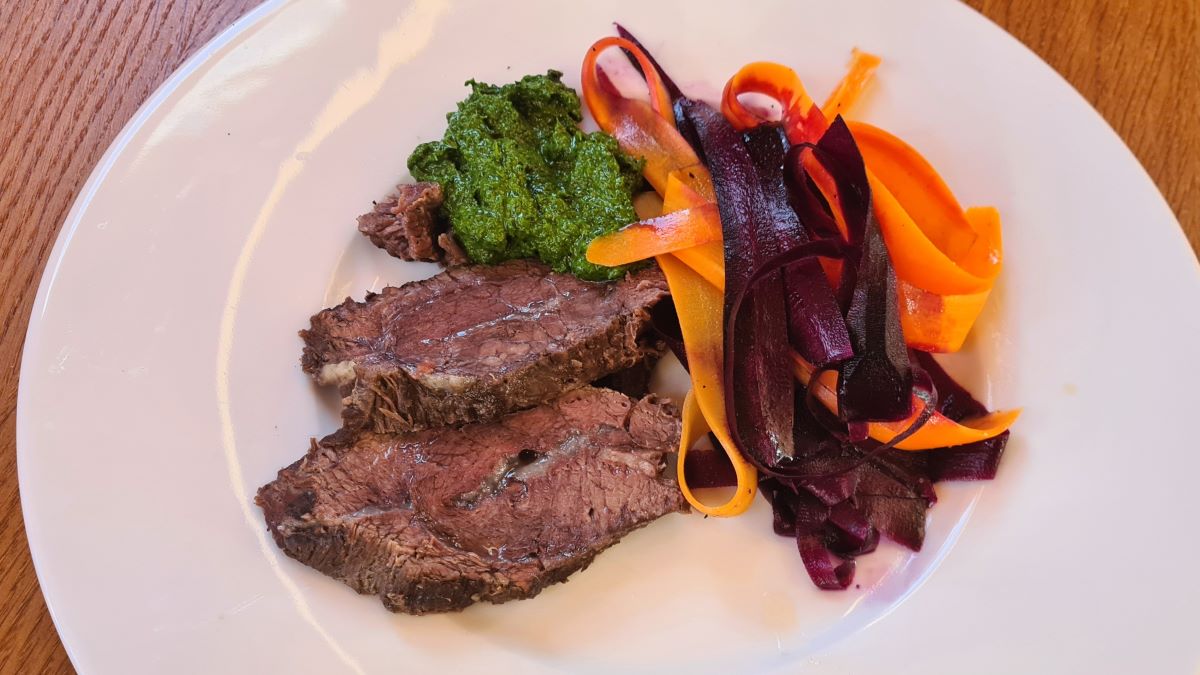 Zum Anrichten das Fleisch aus dem Sud nehmen, aufschneiden und auf den Tellern anrichten. Die Salsa verde an das Fleisch geben und die Karotten neben dem Fleisch platzieren. Sofort servieren.