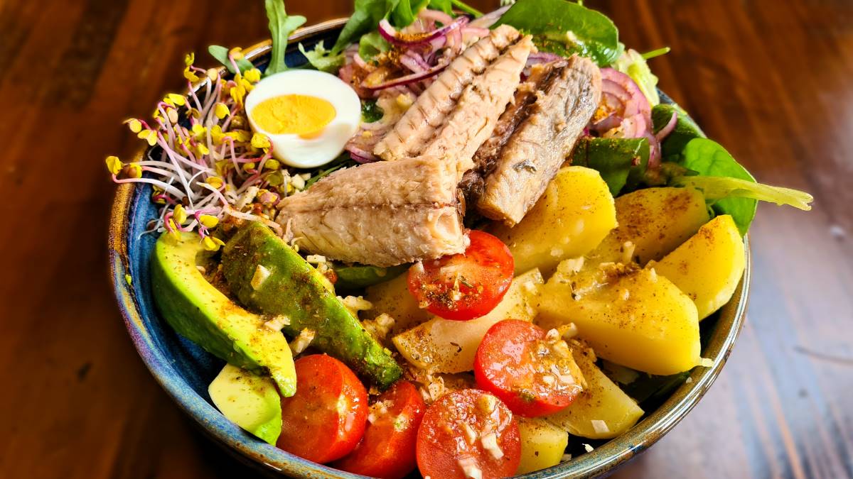 Alle genannten Zutaten gerecht auf zwei Schüsseln verteilen, dabei bowlmäßig anrichten. Mit den Gewürzen, jeweils eine Prise pro Portion, würzen und mit dem zusammengemixten Dressing überträufeln. Zuletzt die Fischfilets und eine leicht gesalzene Eihälfte aufsetzen. Optional mit feingehacktem Knoblauch bestreuen. Auf Mayonnaise haben wir in dieser Version verzichtet.