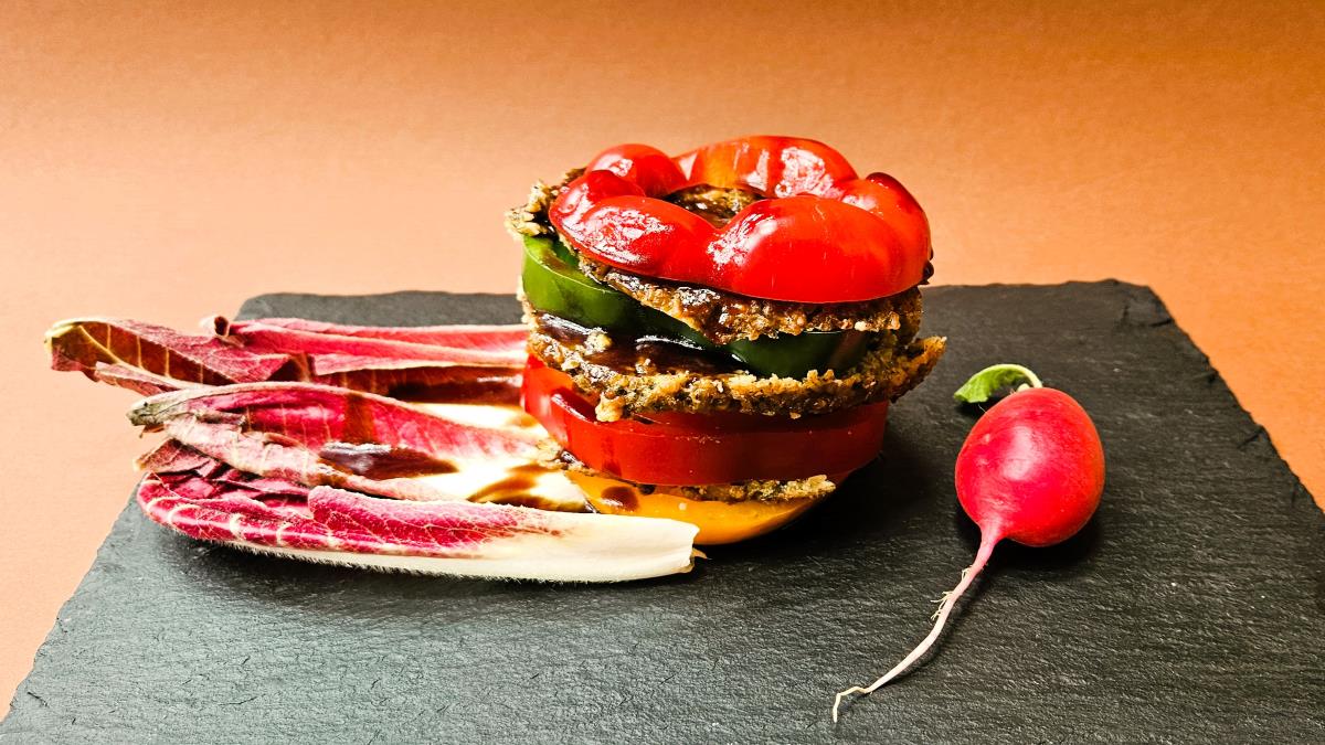 Auf einem Arbeitsbrett werden nun die vorbereiteten Zutaten zum Millefeuille zusammengebaut. Als Basis nehmen wir eine große Scheibe Tomate. Das eine Türmchen basiert auf einer roten, das andere auf einer gelben Tomate, die wir jeweils mit Salz, Pfeffer und Paprikapulver würzen. Darauf legen wir die erste Scheibe Grünkern-Laibchen. Mit einem Löffel verteilen ein wenig vom Dressing darüber. Dann kommt jeweils ein farblich unterschiedlicher Paprikaring und eine kleinere Scheibe Tomate, die in den Ring passt, bzw. das Material vom Grünkernlaibchen-Mittelstück. Wieder leicht würzen, dann die zweite Scheibe Grünkern-Laibchen, so sie ganz geblieben ist. Darauf ein bisschen Dressing einsickern lassen. Mit einer Tomatenscheibe, leicht gewürzt, der dritten Laibchen-Schicht und zuletzt einem Paprikaring abschließen.