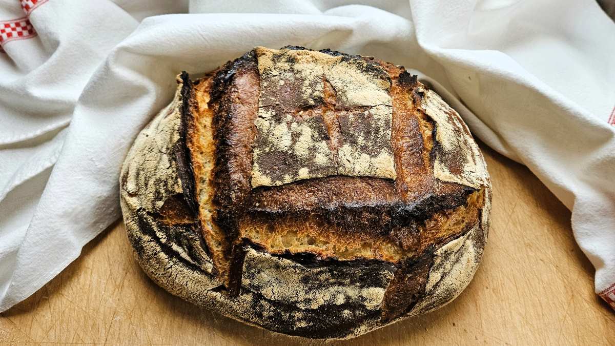 Das Backrohr auf 250° C Ober-/Unterhitze vorheizen, dann das Brot aus dem Gärkörbchen stürzen, nach Belieben kräftig einschneiden und in den Ofen einschießen, gut schwaden und nach 10 Minuten auf 210° C abfallen lassen. Insgesamt 50 Minuten Backzeit rechnen, eventuell nochmals für die letzten 10 Minuten die Hitze reduzieren, falls das Brot zu braun wird. Das Brot auskühlen und sich dann beim Anschneiden überraschen lassen.