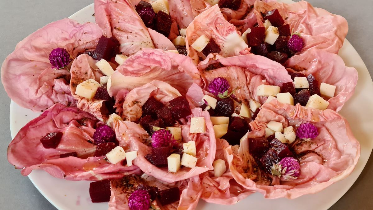 Die Wintersalate sind bei uns häufig mit feineren Radicchiosorten zusammengestellt. Wir mögen die zarten bis deutlichen Bitternoten, die sich mit süßlichen Zutaten wie reifen Zitrusfrüchten – filetierte Orangen und ganze Kumquats sind hier erste Wahl – oder, so wie hier, mit Rüben kombinieren lassen.