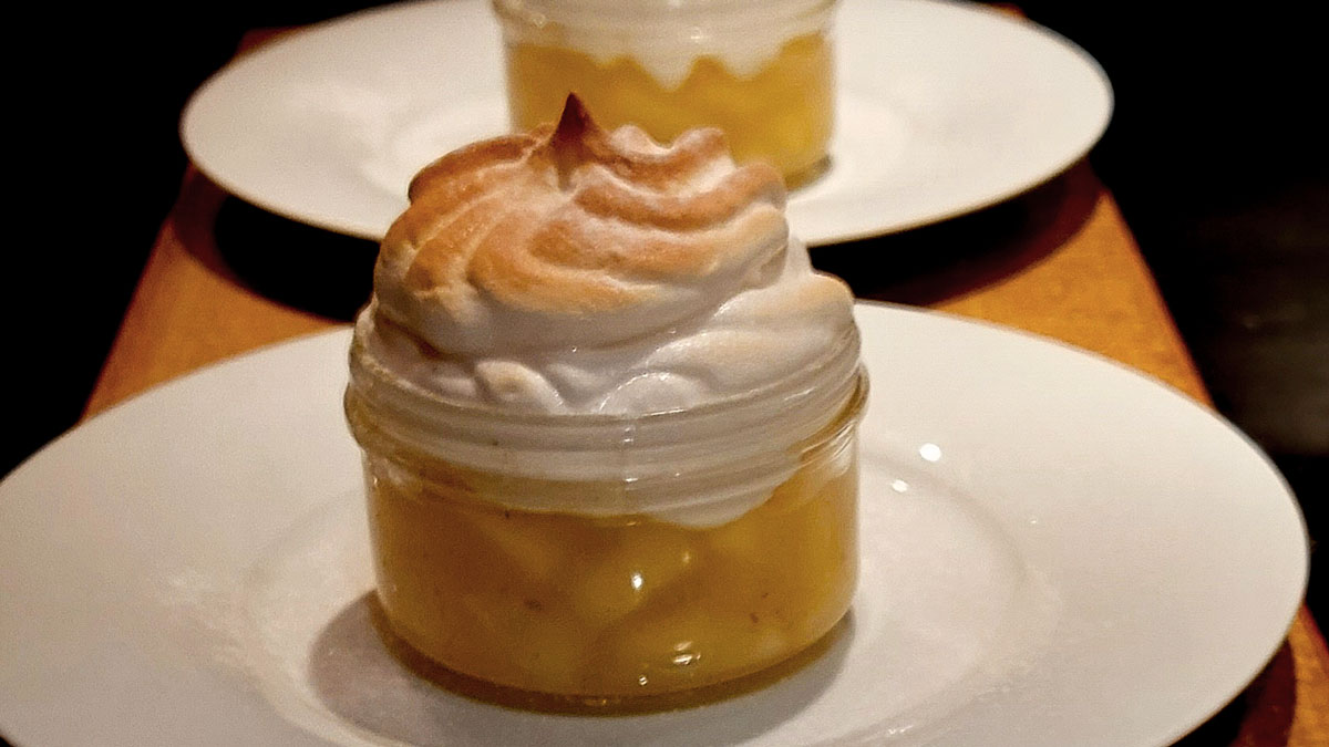 Vor dem Servieren den Feinkristallzucker mit dem Bergamottesaft in einem kleinen Topf mit Hilfe eines Zuckerthermometers auf 117° C erhitzen. Währenddessen das Eiklar zu Schnee schlagen und den exakt erwärmten Zucker hinzufügen. Weiterschlagen bis alles abgekühlt ist. Dann das Kompott in kleine feuerfeste Schüsserln verteilen und den Schnee mithilfe eines Dressiersackes mit Spritztülle auf dem Kompott verteilen (das kann man auch mithilfe eines Löffels, allerdings schaut es hübscher aus, wenn eine Spritztülle verwendet wird).