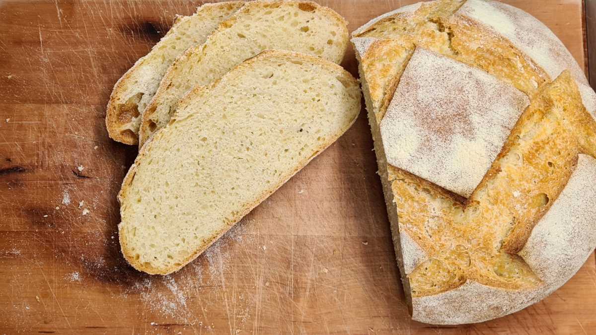 Der Teig zu diesem Brot wird nicht geknetet, also ein „No Knead Bread“, dessen Prinzip schon an anderer Stelle beschrieben wurde. Wir haben uns für ein kleineres Brot entschieden, um bald wieder ein frisches backen zu können. Für kleinere Haushalte empfehlen wir das generell. Erstens hat man dadurch mehr Abwechslung und zweitens ist die Gefahr, dass das Brot alt wird, viel geringer. Und man erspart sich das Einfrieren und wieder Auftauen.