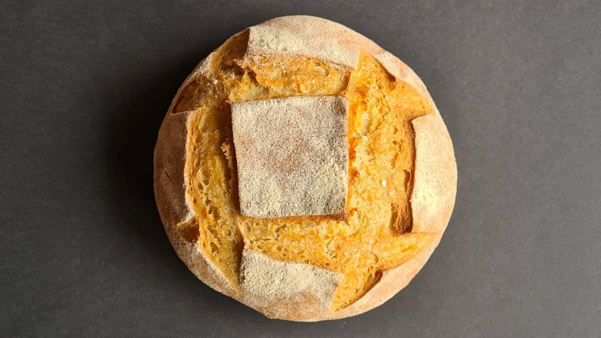 Den Backofen auf 230°C Ober-/Unterhitze vorheizen. Den Teigling sanft aus dem Gärkörbchen stürzen, mit einem Muster einschneiden und in den Ofen mit Schwaden einschießen. Die Temperatur nach 10 Minuten auf 210°C reduzieren und weitere 25 Minuten backen.