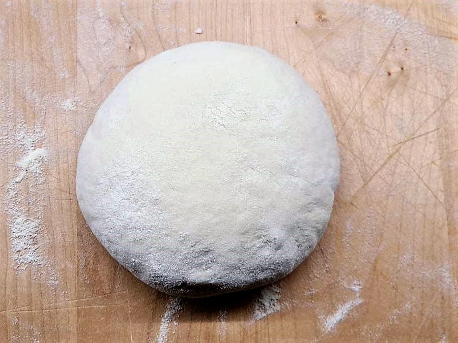 Lievito Madre mit dem Wasser mit einem Schneebesen oder dem Pürierstab aufschlagen und komplett auflösen, Öl, Mehl und Salz hinzufügen und mit einem Löffel so lange mischen, bis alle Zutaten mit der Flüssigkeit vermengt sind und keine Mehlnester übrig bleiben. Zur einer Kugel formen, in eine Schüssel geben und nach einer und zwei Stunden dehnen und falten.