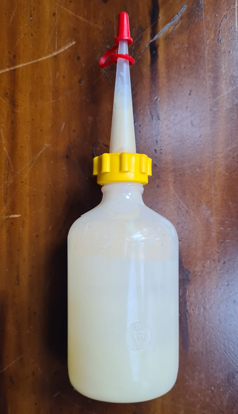 Alle Zutaten in einem Becher am besten mit dem Zauberstab (Pürierstab) kräftig vermixen, so dass keine Klumpen vorhanden sind und der Teig eine geschmeidige flüssige Konsistenz hat. Mindestens 2 Stunden durchziehen lassen, dann nochmals durchmischen und in ein Portionierfläschchen mit einer dünnen Dosierspitze umfüllen.