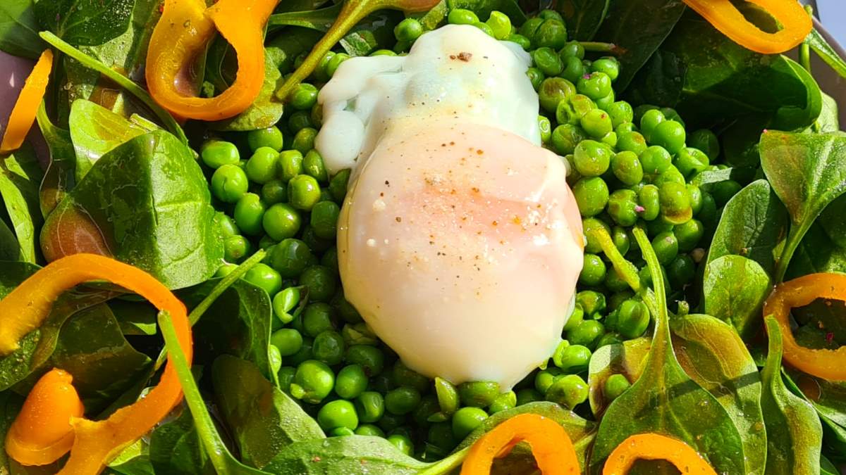 Dieser Salat lässt schon ein wenig Vorfreude auf Ostern aufkommen. Das frische Grün der Erbsen und des Spinats harmoniert nicht nur optisch wunderbar mit dem orangefarbenen Paprika und dem cremigen Dotter. Diesen Salat sollte man so vorbereiten, dass er sofort, nachdem das Stundenei auf den Salat geglitten ist, serviert werden kann.